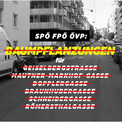 Doch unsere Anträge auf Pflanzungen vonBäumen in der Geiselbergstraße, Mautner-Markhof-Gasse, Dopplergasse, Braunhubergasse, Schneidergasse und Römersthalgasse wurden in der Bezirksvertretung abgelehnt.