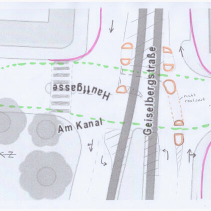 Eine langgezogene Insel, die von der Hauffgasse kommend dem MIV die Geradeaus- und Linksabbiegerelation blockiert hätte, wurde übrigens in letzter Sekunde wieder aus dem Plan entfernt (siehe strichlierte Linie auf der Skizze). Im weiteren Verlauf der Fahrradstraße wurden auch Gehsteige vorgezogen und Beete zur Sichtfreihaltung angelegt.