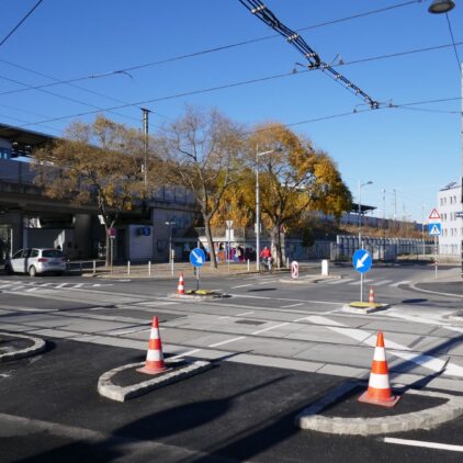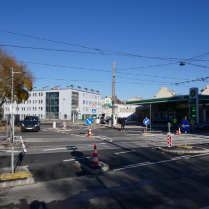 Die komplexe Kreuzung mit Straßenbahngleisen, überbreiten Fahrbahnen und Abbiegerelationen war auf dieser Hauptradroute ein Gefahrenpunkt. Nun wurden mehrere Verkehrsinseln errichtet, um Menschen am Rad oder zu Fuß die Querung zu erleichtern.