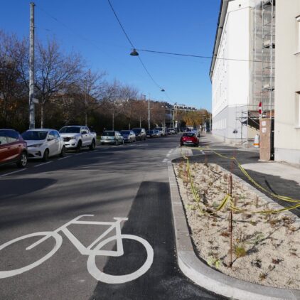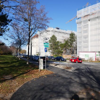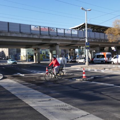 Die Fahrradstraße „Am Kanal“ mit ihrem Herzstück Kreuzung Geiselbergstraße ist beinahe fertig.